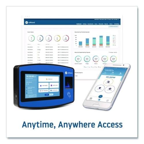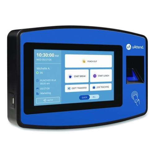 The uAttend NX2500 biometric fingerprint touch tablet time clock includes everything you need to effortlessly track time and attendance. The system offers multiple capabilities within one device, including a fingerprint scanner, RFID, PIN, and web browser punching, plus offline mode and easy Wi-Fi or LAN connection. This easy-to-use time clock offers support for an unlimited number of employees and departments, large touch-screen display, and biometric fingerprint scanner to help eliminate costly buddy punching. The time clock is Cloud-connected, so it automatically sends all time clock data to the Cloud in real time, where you can view it from any web browser. The Cloud lets you automate your timekeeping processes by letting you set up automatic rules for punch rounding, lockouts, breaks, overtime, and accruals to help you stay in line with compliance and accurately calculate your employees' hours. Access dozens of reports with business insights and analytics, and export payroll reports to your payroll provider or directly to QuickBooks Desktop.