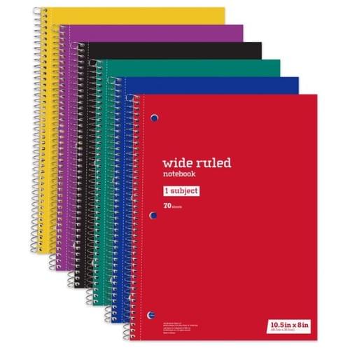 Just Basics Spiral Notebook, 8" x 10-1/2", Wide Ruled, 70 Sheets, Assorted Colors, Pack Of 6 Noteboo