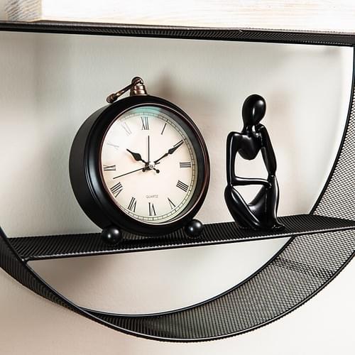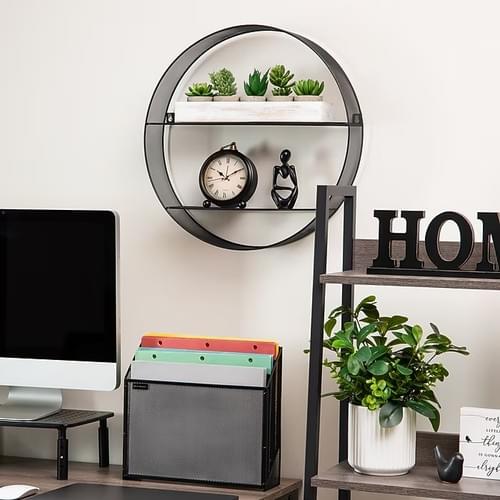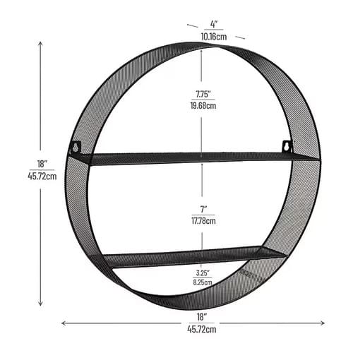 Stylish Round Wall Shelves: This round wall shelf features a black metal mesh frame with two shelves. It's perfect for displaying books, photo frames, or decorative items. Equipped with round metal eyelets for secure wall mounting.