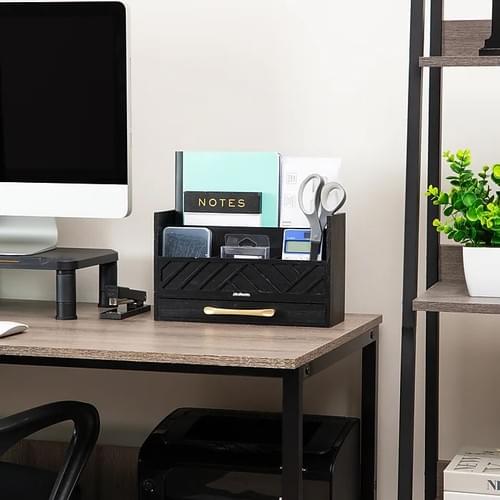 Efficient and versatile design: Featuring four compartments and one lower drawer, this wooden organizer offers simple yet effective storage options for your bills, recipes, accessories, files, and more