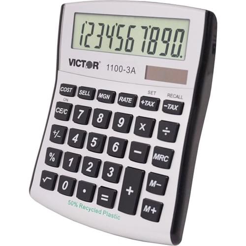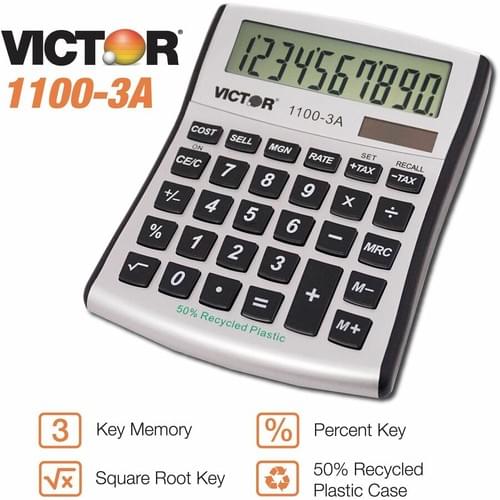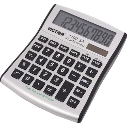 10-digit calculator is a Victor best seller and is perfect for the home or office. Features a large easy-to-read angled LCD display. The contemporary silver and design is a refreshing look for your calculator. Engineered with an antimicrobial agent that reduces the growth of microbes and bacteria on the product, which can cause discoloration and odors. Manufactured with recycled plastic. Other functions include: automatic tax keys, well-spaced keys, percent key, square root key, 3-key independent memory and automatic constants. Operates on hybrid power (solar/battery backup).